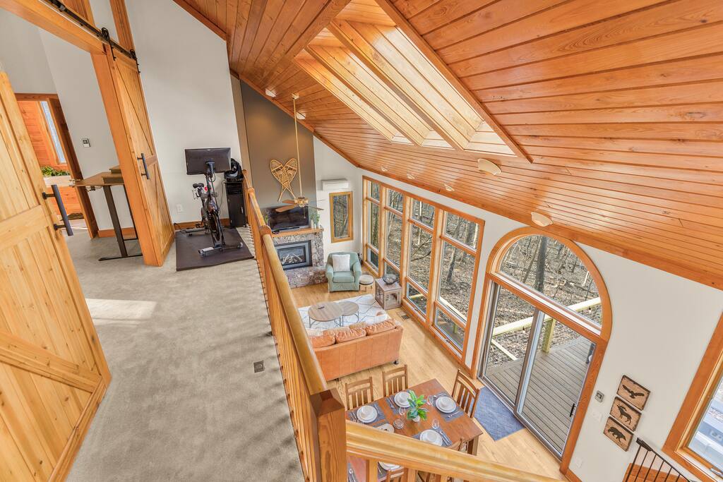 We have named our home "Chat n Chill on the Hill," because it is the perfect setting to connect with loved ones in a peaceful setting. We are located in the heart of beautiful Wintergreen in Virginia, which has tons to do for all ages, year-round. We are just a few minutes’ drive to the slopes and all the dining and entertainment at Wintergreen. Some of the best hiking trails in the state are off the Blue Ridge Parkway (15 minutes from the home), plus there is a great waterfall trail just down the street (see the photo in the listing). Also nearby are two sandy-beach-entrance lakes plus a community pool for swimming, and over dozen wineries, breweries, and distilleries- all within a 30 minute drive. The house has 4 bedrooms and 3.5 bathrooms, with the layout as follows: Main level: - Main level deck features two propane firepits with ample seating, outdoor dining table that seats 10, and gas grill (propane provided) - Living room with working propane fireplace and big screen smart TV - Dining area for 8, plus room for 4 more at the kitchen bar - Fully stocked kitchen with granite counters, stainless appliances, plus coffee bar (coffee provided) - BR1: Queen master bedroom with ensuite full bathroom - Half bath Upper level: - Loft area overlooking living room with Peleton exercise bike - BR2: King master bedroom with ensuite full bath featuring soaker tub and tile shower Lower level: - Additional living room / game room with pullout sofa, shuffleboard, darts, and arcade game - BR3: Queen bedroom - BR4: Bunk bedroom with queen bed on the bottom, twin on the top - Full hall bath with dual vanities - Laundry room with full size washer and dryer - Lower deck features additional seating Accessibility: - The distance from the parking area to the front door is 26 steps. - You must go up 8 steps to enter the house; there is no step-free entrance. - No bedrooms are accessible without using steps. - There are no grab bars by the toilet or bath. - The main entrance is wider than 32 inches.